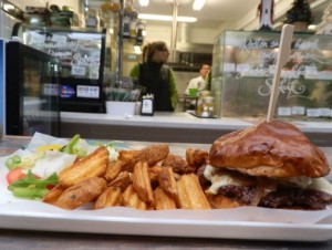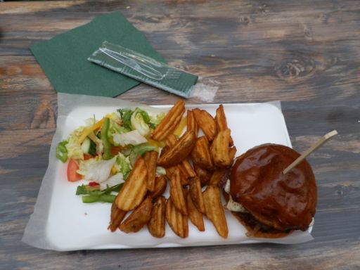 Mivel a hely alig pár hetes, az alapoknál kezdtem. Azaz az általában mindenütt kapható hamburgerrel nyitottam. Amit az ízléssel kialakított „teraszról” nyíló pult mögött, a szemem láttára készített el az elegánsan felöltözött séf (nem mosatlan, pecsétes, undormány szerkóban, mint oly sok magyar büfében). Hétköznap révén nem kígyózott a sor a pult előtt, így viszonylag gyorsan elkészült a rendelésem. Ami végül egy tényleg friss, ízletes buciba helyezett, remekül fűszerezett húsból és mérsékelten adagolt egyéb töltelékből állt, de olyan remekül kombinálva, hogy így visszagondolva is összefut a nyál a számban. Az elengedhetetlen tálcán a hamburger mellé remek steekburgonyát és valóban friss salátát tálaltak. Azaz minden a helyén volt. Az ízek, a mennyiség, az ár, a helyszín és a személyzet által hozzáadott érték.