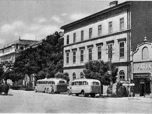 A kép közepén két autóbuszt látunk, amelyek akár a fotózás időpontjának azonosításában is segítségünkre lehetnének, hiszen mintha az első járművön még a MÁVAUT felirat szerepelne. Márpedig a MÁVAUT 1953-ban átalakult Autóközlekedési Vállalattá (AKÖV), így ha jól veszem ki a feliratot, a fotónak legalább öt évvel azelőtt kellett elkészülni, hogy feladták. Persze lehet, hogy tévedek, hiszen az első autóbusz – a hátul dupla tengelyes – márkáját sem tudom azonosítani, egyetlen tippem az lenne, egy Skodával van dolgunk. A mögötte álló viszont egyértelműen egy 30 személyes Rába Special, ami akár 1938 óta is szolgálhatta az akkori utazóközönséget.