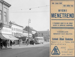 Az Állami Hirdető Vállalat Szolnoki Kirendeltsége az ötvenes években rendszeresen kiadhatta a Szolnokról induló és oda érkező vonatok és autóbuszok menetrendjét praktikusan zsebre rakható, ingyenes füzetecske formájában. A kiadás költségeit minden bizonnyal a kisnyomtatványban elhelyezett hirdetések fedezhették, miként az is valószínű, hogy ha a reklámok mellett maradt hely, akkora azokon hasznos információkat is elhelyeztek a szerkesztők. Az 1955 októberétől 1956 májusáig érvényes Téli menetrendet már bemutattam, most következzen az 1956-os nyári, ami az előzőtől eltérően már csak kék-fehérben – a piros kísérőszín elhagyásával -, 28 helyett csak 24 oldalon jelent meg. Címlapján ezúttal is a Szolnoki Állami Áruház hirdetett, ami a Kossuth és a Szapáry utcák sarkán, a mai Árkád helyén, a néhai Nerfeld-palotában működött, és inkább, mint régi Centrum él a helyiek emlékezetében. Ahol 1956 tavaszán a rádió és a Dongó kerékpár segédmotor lehetett a vásárlásra csábító különlegesség.