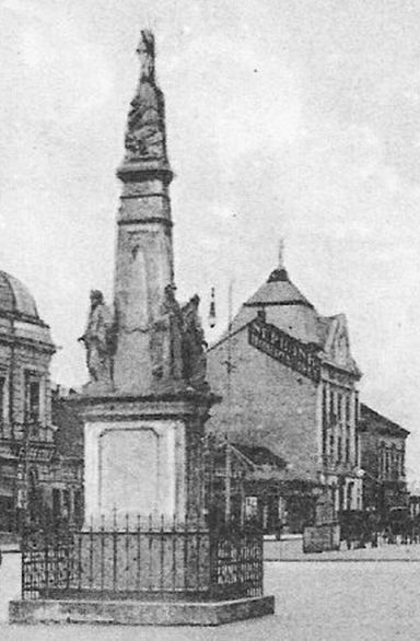 A Városháza melletti földszintes házakat és a Magyar utca torkolatát – ahol ma a borzalmas tetőtérrel tovább csúfított, a hatvanas évek közepén emelt társasház áll -, a fotó középpontjában lévő a Szentháromság szobor takarja ki. A szobor itt nagyon jó állapotban van, így egy néhány évvel korábbi fotót használó képeslap alapján azt feltételezem, hogy nem sokkal e kép készítése előtt került vissza a helyére. Ahol ma már nem találjuk. Ha jól tippelem, a Táncsics Mihály utca torkolatában ma a zászlórudak állnak a helyén. A Szentháromság szoborból megmaradt torzó – a középrész négy alakja, illetve a tetején lévő szobor nélkül – a Belvárosi Nagytemplom mellett, majdnem a Szomorú Krisztus szoborral szemben található. Fogalmazzunk finoman: elképesztő állapotban!