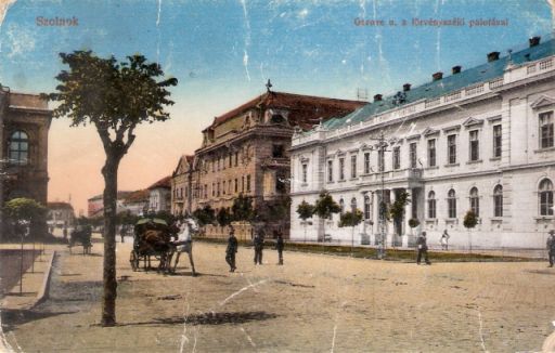 Így nem nagyon bánkódhatott azon, hogy a festett képeslap egy nyári pillanatot örökít meg Szolnokon. Nem hinném, hogy elmélázott azon, vajon a Gorove utca merre is lehet az állomáshoz képest, és a törvényszéki palota mellett milyen épületek láthatók még a képen. Neki akkor nem igazán lehetett fontos, hogy a képeslapon megörökített palotasor Szolnok éppen véget érő aranykorának egyik emblémája a biztosító bérházával, a Mezőgazdasági Takarékpénztár épületével, a megyeházával vagy a távolban a pénzügyi palotával és a Steiner féle házzal.