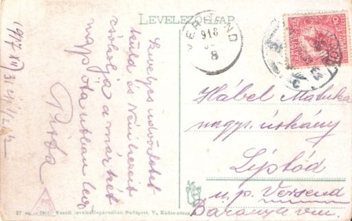 A Baranya vármegyében lévő Liptódon élő Hábel Marika 1918. január 8-án kaphatta meg a képeslapot. Amikor Pista talán már a Kárpátokban harcolt. Vagy ha kevésbé volt szerencsés, akkor már életét adta egy széthulló birodalomért, egy ingó trónon ücsörgő királyért, egy olyan lassan száz éve kitört háborúban, ami nem ért véget, mire lehullottak a levelek.