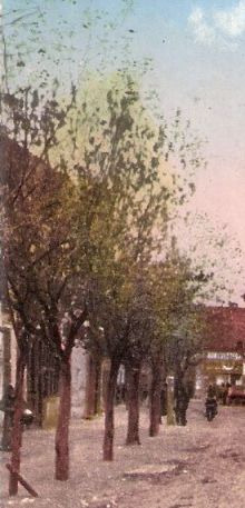 Akár festmény is lehetne ez az 1915-ben postára adott képeslap. Ám a reklámtáblák és a le nem mázolt feliratok miatt tűnik egyértelműnek, hogy egy fekete-fehér fotót próbáltak utólag színessé varázsolni. Hinni szeretném, hogy a piktor a házak színét illetően nem hazudott.