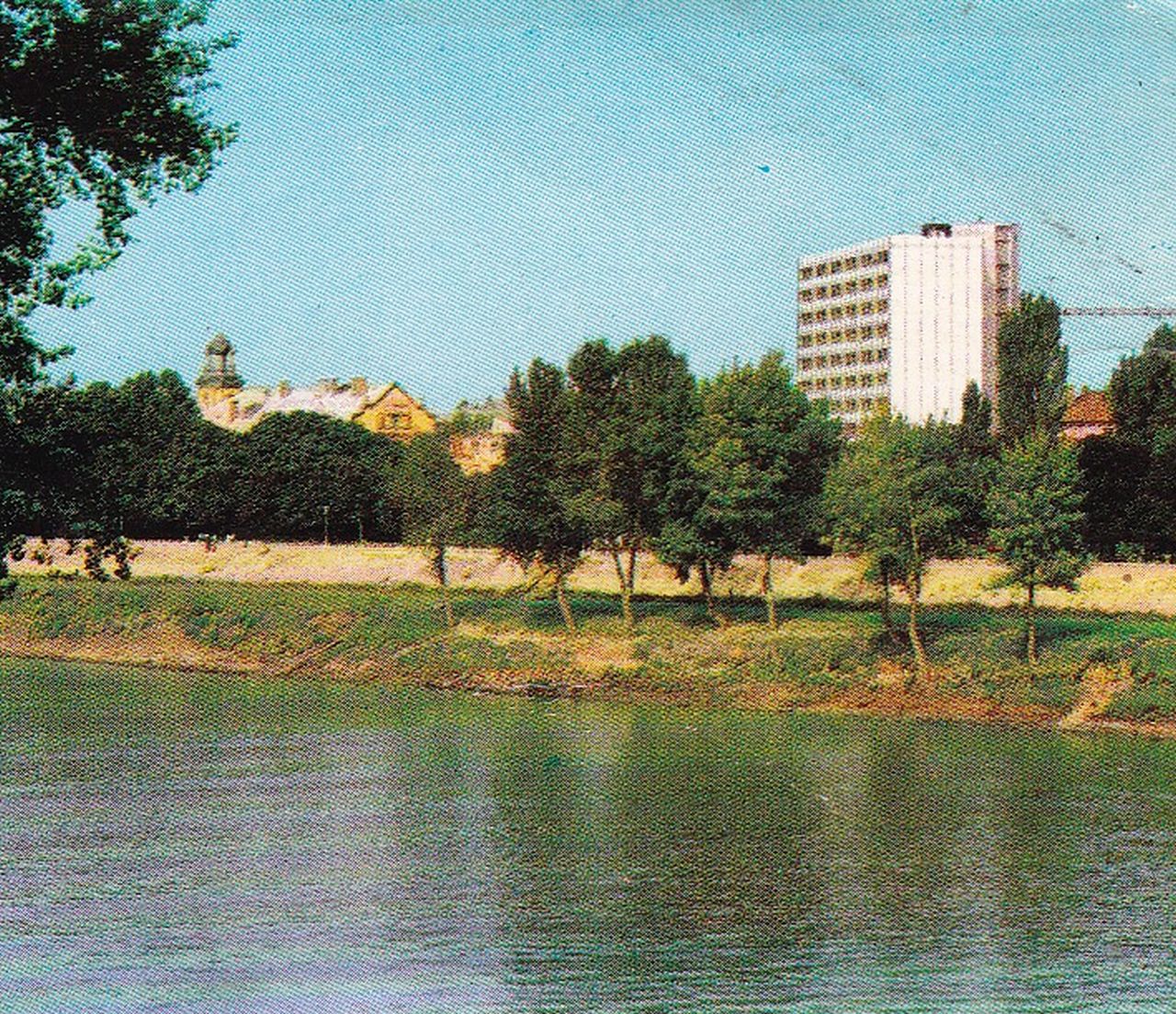 Úgy tűnik, hogy a budapesti szerkesztők – talán költséghatékonyság miatt – ismét nem gondolkodtak új felvételekben, amikor eldőlt a mellékelt négyképes anziksz nyomdába adása. Legalábbis a négy felvétel közül három – jelen tudásom szerint – korábban már megjelent nemcsak önálló képeslapként, de könyvborítóként illetve könyvillusztrációként is. Az egyetlen kivétel a lap jobb felső felvétele, ami vagy a vízügyesek egykori épületének tetejéről vagy az Aranylakat teraszáról örökítette meg a belvárosi Tisza-partot, lényegében az akkori Marx (ma Verseghy) park alatt. Hogy legfeljebb csak néhány éves felvételről van szó, azt leginkább a katonai tízemeletes mutatja, amit a hatvanas évek végén adtak át. Azt hiszem, nem ezt, és még csak nem is a Tisza szállót, hanem a folyót és a még fás árterét szerette volna megörökíteni az ismeretlen fotós. Persze nem kizárt, hogy ebből a felvételből is lett önálló képeslap, én mindenesetre még nem találkoztam vele.