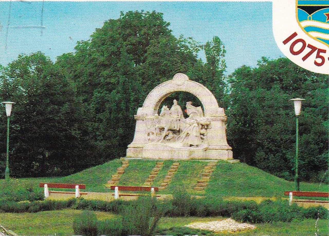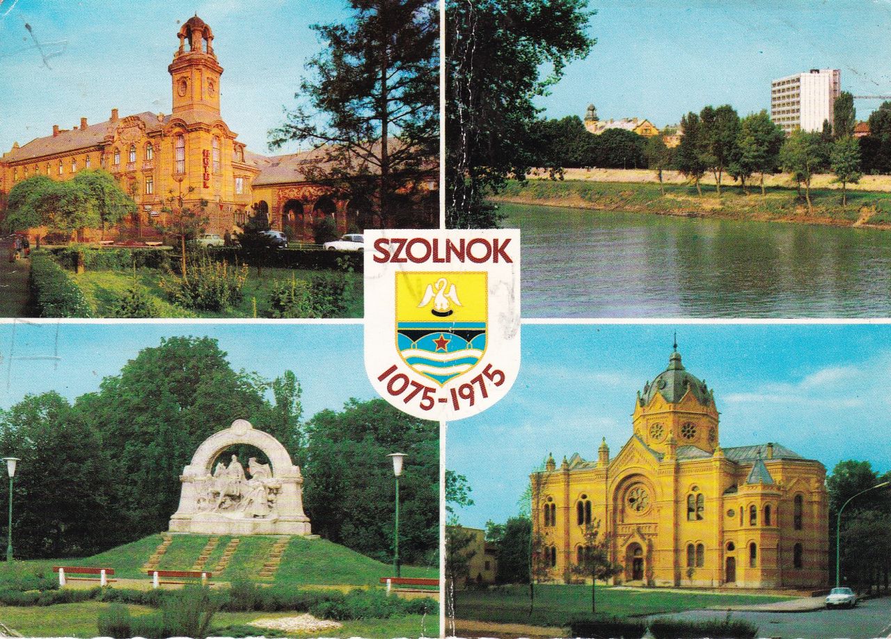 Sajnos nem tudom, hogy e képeslap szerkesztője milyen elvek vagy koncepció alapján válogatta a képeket. De úgy tűnik, a város szocialista fejlődéséből jóval kevesebbet akart megmutatni, mint a másik – a blogSzolnokon már bemutatott – két mozaiklap összeállítója, hiszen a katonai tízemeletesen kívül minden egyéb, ami ezen az anzikszon látható, a második világháború előtt épült. Nem próbált sem a megyeszékhely, sem a katona- vagy vasutasváros, sem a közlekedési vagy oktatási központ felé közelíteni, talán csak a képek szépsége motiválta. Szerintem ezért került a bal alsó sarokba Szolnok máig legrégebb óta ugyanazon a helyen álló, emberalakokat ábrázoló szobra, a Damjanich-emlékmű. Aminek persze a mából nézve van némi bája: a városból rég eltűnt lámpák, meg a lassan elkopó, az emlékművel szemben álló, piros deszkás padok. De hát az 1975-ben 900 éves jubileumát ünneplő városhoz ezek is hozzátartoztak.