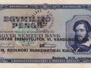 Azaz rányomtak két bélyegzőt. Egy köralakút, amelyen Szolnok aktuális, csillagos címere körül a „Szolnok város kilencszáz éves” felirat olvasható. És egy másik, hosszúbélyegzőt, amire a „Magyar Éremgyűjtők VI. Vándorgyűlése” illetve a „III. Szolnoki Numizmatikai Kiállítás” és a két rendezvény dátuma, „1975. március 15.” került. A mából nézve számomra kicsit vicces, hogy a kibontakozó olajválság, az új gazdasági mechanizmus utóhatásai és az ország fokozódó eladósodása közepette 1946 után ismét meglóduló infláció idején pont egy ilyen bankjegyet osztogattak 1975-ben. Persze lehet mondani, hogy ez az előző rendszer romlottságára is utalhatott, meg az 1 millió pengős bankjegy szépsége volt az ok. Sőt talán a praktikusság – volt belőle elég – is a korabeli ötlet mellett szólhatott. Mindenesetre ezt az egyébként tényleg nem túl értékes bankót kicsit felértékeli a rákerült két alkalmai bélyegző. És persze felmerül a kérdés, hogy vajon csak ilyen Kossuth arcképével díszített 1 millió pengősökre került ez a két szolnoki pecsét, avagy más címletekre is? Illetve mi lett a sorsa a szolnoki numizmatikai kiállításoknak?