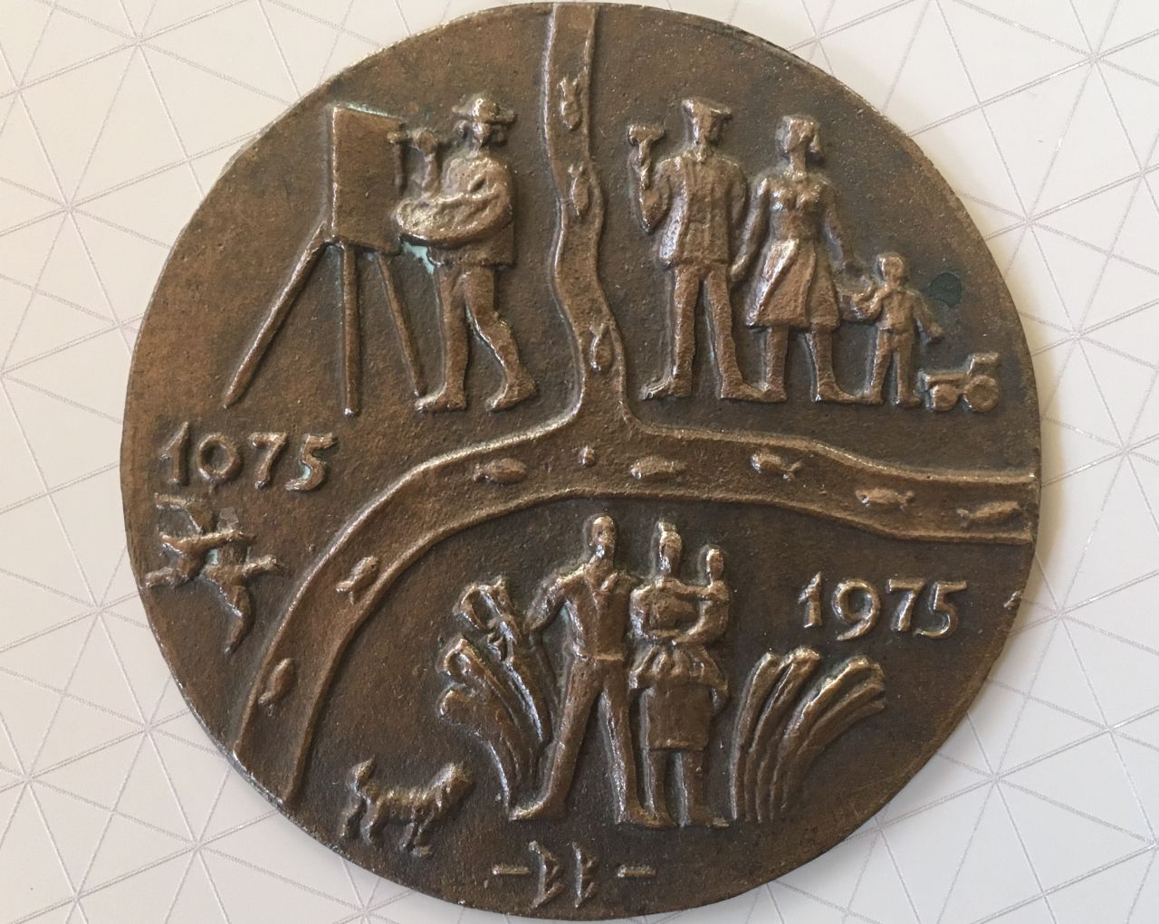 Szolnoki kötődését csak az avatottaknak árulják el a rajta szereplő évszámok: 1075 Szolnok első írásos említésének dátuma, 1975 pedig az az év, amikor a város sok-sok beruházással, kulturális eseménnyel és kisebb-nagyobb tárggyal ünnepelte meg „fennállásának” 900. évfodulóját. Szolnokiként természetesen egy másik dolog miatt is beugorhat a kisplasztika városhoz való kötődése, hiszen az apró domborművet halakban gazdag folyók osztják három részre, és ezeknek a folyóknak az íve és a találkozása nagyon emlékeztet a Tiszára és a Zagyvára Szolnoknál.