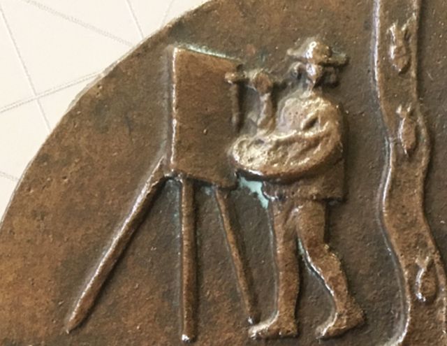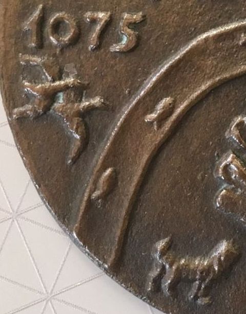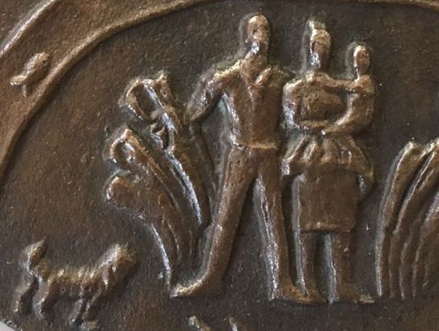 Úgy tűnik, hogy Búza Barna (1910-2010) szobrász- és éremművész 1975-ben legalább kétféle kisplasztikát készíthetett Szolnok 900 éves évfordulójához kapcsolódóan. És az is valószínű, hogy ezeket a kisplasztikákat olcsóbb bronz és drágább ezüst anyagokból is sokszorosították, majd pedig osztogatták. A korábban bemutatott, a török emlékeket és a szocialista ideákat összemosó, mindkét oldalán kidolgozott kisplasztikával szemben legújabb szerzeményem, bár a korábbinál nagyobb méretű – 10 centi átmérőjű -, ám szerényebb vastagságú, és csak az egyik oldala kidolgozott. Csak feltételezem, hogy eredetileg piros, felnyitható fedelű, csatos, belül műbársony bélésű dobozban vehették át az arra érdemesek.