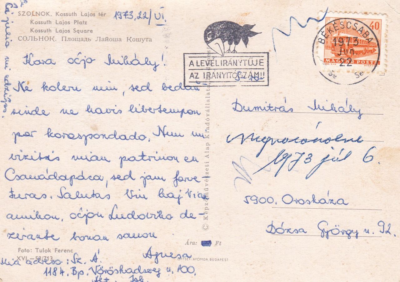 A fotózás legutolsó dátumát pedig a birtokomban lévő képeslap postára adása jelöli ki. Egy minden bizonnyal Szolnokon csak átutazó, román nemzetiségű lány küldte Orosházára 1973. június 2-án. Ám annak az évnek a tavaszán már nem készülhetett ez a képeslap, hiszen hiányzik róla az irányítószámnak szánt hely, amit pedig 1973. január 1-jétől használunk Magyarországon. Annak pedig elég kicsi az esélye, hogy a monopolhelyzetben lévő hazai képeslapgyártó 1973-ban még kiadott volna olyan lapot, amin nincs helye az irányítószámoknak, miközben a rendszerre való átállás már legalább egy évvel korábban elindult.
