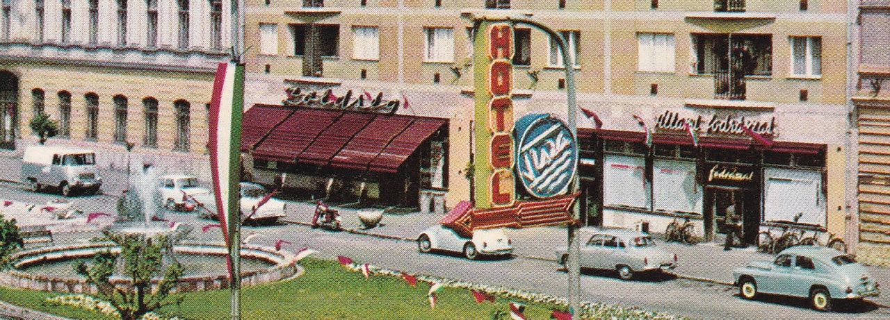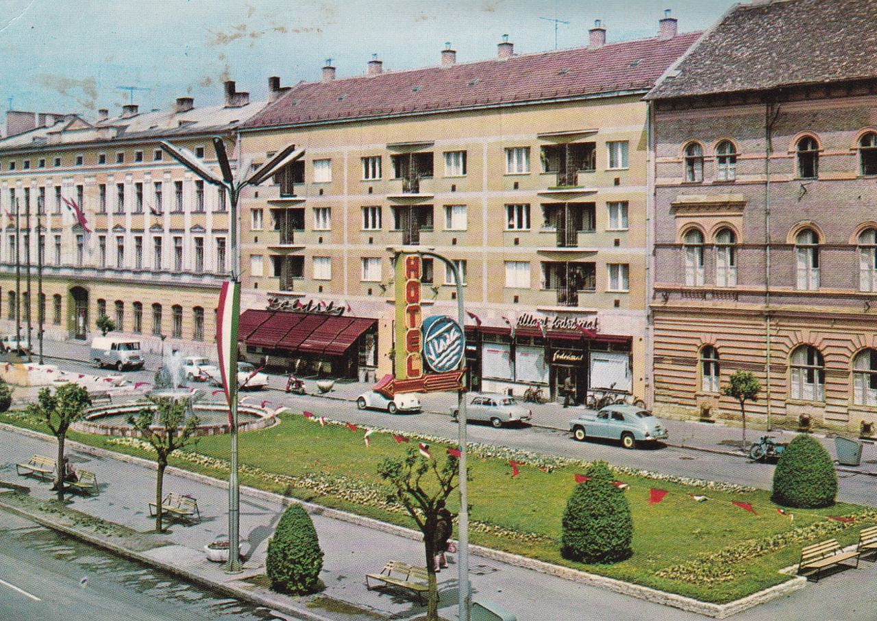 A datálás mellett számomra három érdekesség van még ezen a képeslapon. Az egyik természetesen a parádés autópark a Warszawával, a 900-as Wartburggal, a bogárral – amit ekkoriban még a Merkúr is forgalmazott -, a piros Jawa motorral, majd a számomra ismeretlen nyugati autóval, a 601-es Trabanttal, a még lapos orrú Nysa kisteherautóval és a 311-es Wartburggal. A másik a fotó közepén lévő Hotel Tisza fényreklám, amiről nagy valószínűséggel elmondhatjuk, hogy Szolnokon készült, már csak azt nem tudjuk, mikor került a térre. Egy 1963-as képeslapon még nincs rajta, így ennél csak később helyezhették el.