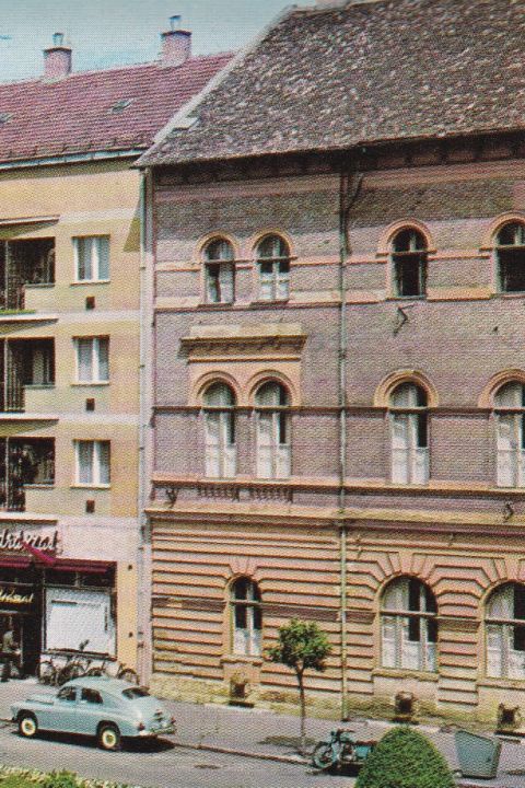 Danka István, mint a megyei tervezővállalat fotósa, 1981 tavaszán felmászott az akkor még működő Ságvári Endre Művelődési Ház tetejére, hogy megörökítse a Nerfeld-palota bontását.