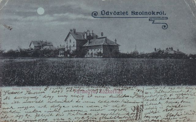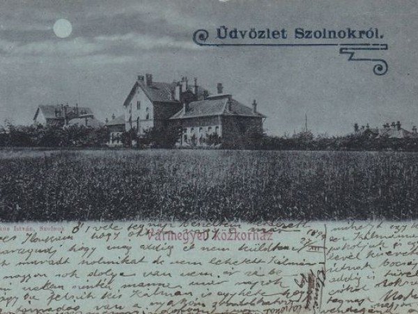 Szerintem a kiegyezésnek (1867) és a megyeszékhellyé válásnak (1876) köszönheti Szolnok, hogy a millenniumi ünnepségek (1896) idejére végre saját, négy önálló osztállyal működő közkórháza lett. Azt meg a Monarchiának, hogy az építkezés végül 175 ezer forintos költsége nem a várost és a megyét nyomasztotta a felvett hitelek miatt, hiszen 1898-ban az állam átvállalta a kórház építésével kapcsolatos költségeket. Így, amikor ezt a képeslapot 1899. december 27-én Szolnokról Tiszafüredre küldték, a képen látható „vármegyei közkórház” már harmadik teljes évének a vége felé járó, mondhatni illusztris intézménye volt a városnak.