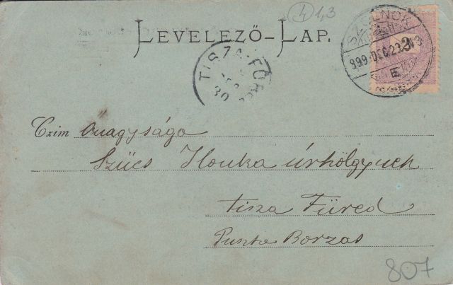 A tulajdonomban lévő képeslapot a 19. század vége előtt 4 nappal írták és postázták. Mint látható, az anziksz képes oldalára próbálta a feladó a lehető legtöbb üzenetet felírni. Ami tulajdonképpen 1899-ben szabálytalan volt, hiszen az úgynevezett hosszú címzéses – azaz a címzésnek az egész hátlapot fenntartó – képeslapokat nem arra találták ki, hogy azon mindenféle egyéni üzenetek utazzanak. Minden bizonnyal csak a véletlennek köszönhető, hogy a Tiszafüreden élő Ilonkának beszámoló ismeretlen, családja egészségügyi problémáiról is ír. Ha jól értem, se a Kálmán nevű férje, se a kis Kálmánka, se az anyós nincs túl jól, ezért elmaradtak valami csomag küldésével, és kvázi a 20. századra ígér egy hosszabb levelet.