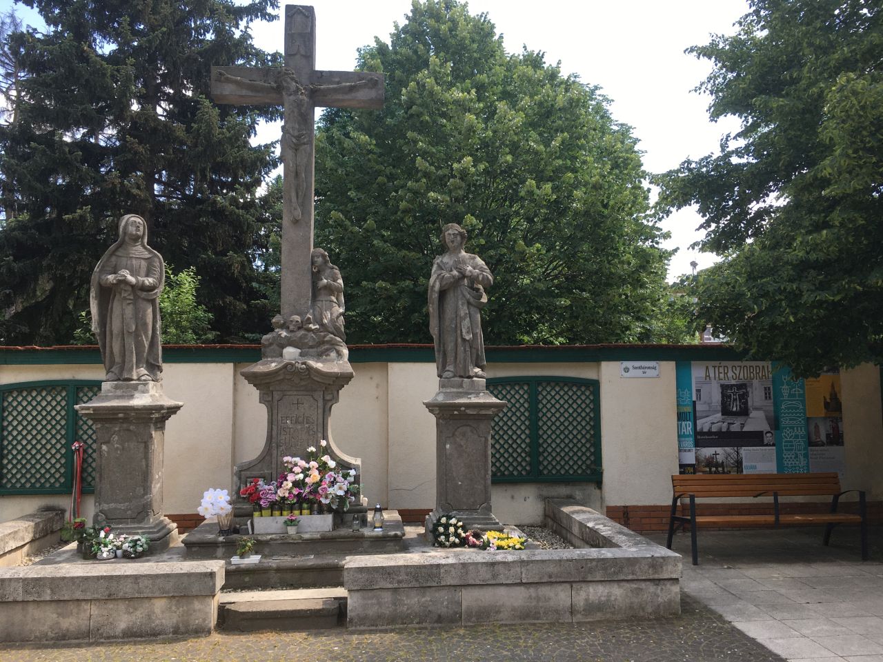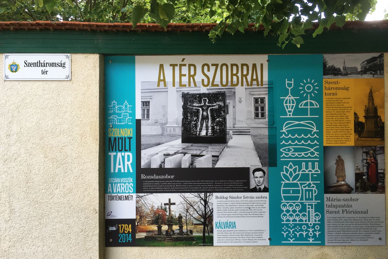 Az alig két évtizede a mai helyén álló Kálvária túloldalára került a tér szobrait bemutató tabló. Nem Szolnokon lennénk, ha ezek között nem lenne olyan, amelyik jó ideje nincs már a helyén („Rozsdaszobor”), meg olyan is, amelyik alig félévszázad után került a templom tövébe, de lassan 70 éves nem sikerül felújítani vagy pótolni (Szentháromság-torzó), no meg megmentett (Mária-szobor) és új alkotás is. A negyedik tabló a tér nyugati oldalán álló egykori gimnázium és a „csak” 90 éves cserkészház történetét villantja fel. Nem megfeledkezve az innen induló szolnoki középfokú oktatásról, no meg az oly sok néven, oly sok funkciót betöltő közművelődési intézményről sem. (A szabadtéri sínpad története már fel se fért.)