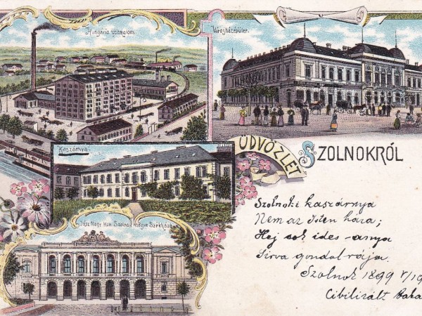 Talán a legszebb 19. századi, szolnoki képeslap a helybéli Fuchs Lipót és fia gondozásában megjelent, négy rajzból összeállított, még úgynevezett hosszú címzéses mozaik, aminek a tulajdonomban lévő példányát egy ismeretlen katona 1899. május 19-én küldte Túrkevére. Mivel az aláírásban önmagát „cibilizált” – talán civilizált lett volna – bakaként jelölő fiatalember a bal oldali középső rajzon a „kaszárnya” kifejezést külön is aláhúzta, talán joggal feltételezhetjük, hogy ott töltötte sorkatonai szolgálatát. Ami már akkoriban se lehetett felemelő élmény, legalábbis erre utal az a kis versike, amit szabálytalanul – hiszen 1905-ig a hosszú címzéses képeslapokon nem volt hely külön szövegnek, ilyesmire a távirat vagy a levél szolgált – az anziksz képes oldalának üresen hagyott jobb alsó negyedébe írt. „Szolnoki kaszárnya/Nem az Isten háza/Hej sok ides-anya/Sírva gondol rája.” Mivel a címzett egy úrhölgy – nevezett Frankó Ottilia -, feltételezhetjük, hogy a baka a lapot nem az édesanyjának, legfeljebb valamelyik leánytestvérének küldhette Szolnokról. Aminek köszönhetően Szolnok négy épületéről is rajz maradt ránk.