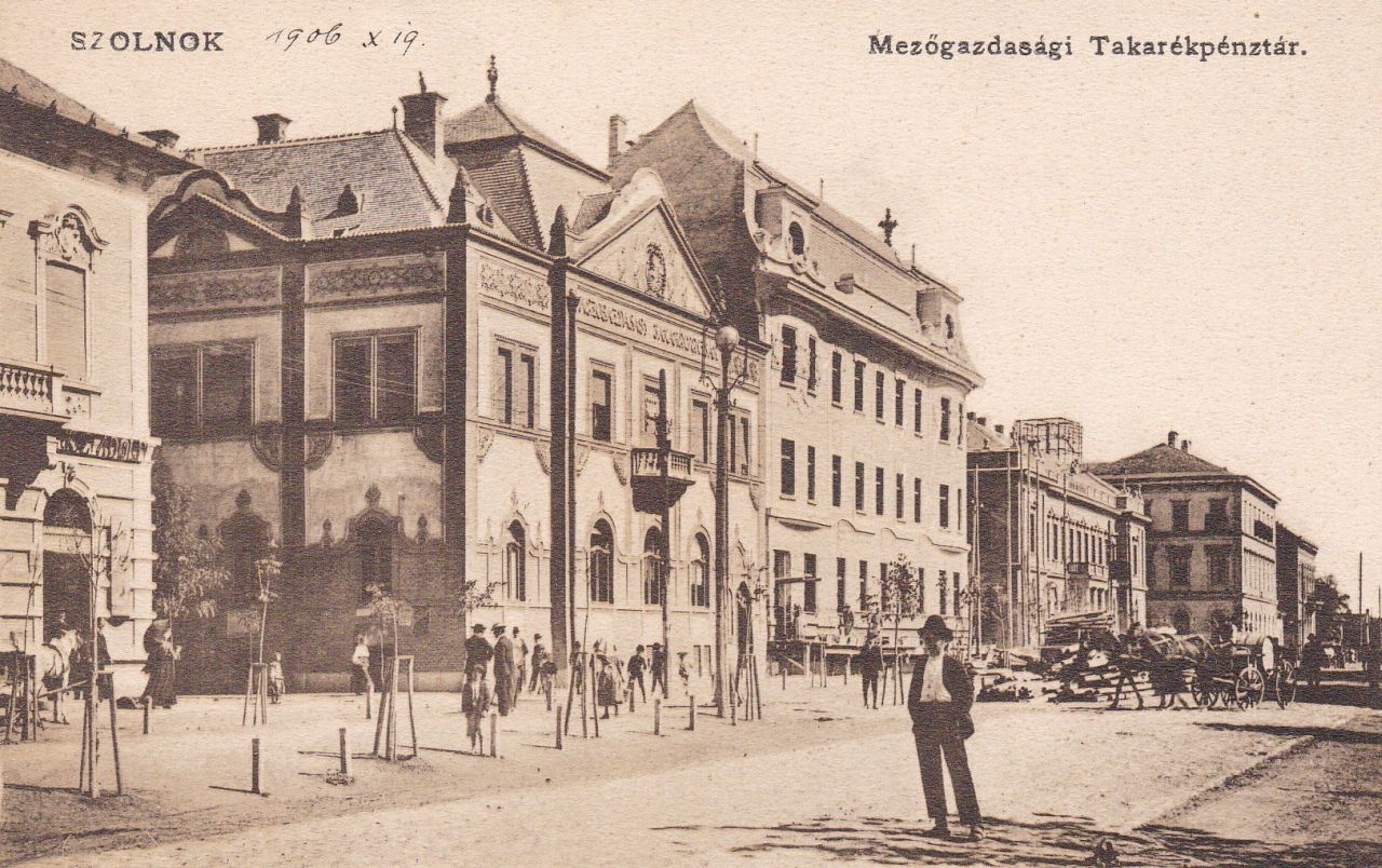 Róth Dezső, az éppen felfutóban lévő szolnoki képeslapbizniszbe is érdekelt helyi nyomdász és kiadó 1906 elején megbízást kaphatott a Mezőgazdasági Takarékpénztártól, hogy amolyan reklám jelleggel anzikszon jelentesse meg a pénzintézet nem túl régen átadott Kossuth utcai székházát. Az ifjú Róth – aki éppen abban az évben indította vállalkozását, nyomdája pedig még a 30-as években is működött a Kossuth tér sarkán – nem engedhette meg induló üzletének, hogy egy ilyen megbízást elszalasszon, így vagy ő, vagy a fotósa azonnal rohant a Kossuth és az Arany János utca sarkához a megfelelő kép elkészítése érdekében. A nagy sietséget meg a még hiányzó szakértelmet bizonyítja, hogy a szecessziós banképületről nem csak hogy olyan kép készült, amin az egész utca látható – a bankpalotát csak a helyiek vagy a jószeműek fedezhetik fel a képen -, de még egy építkezést is sikerült megörökíteni. Szerencsénkre. Így Róth Dezső, valószínűsíthetően egyik első képeslapja a mából nézve sokkal kevésbé reklámfotó, mint inkább egy helytörténeti forrás, amin sokkal érdekesebb a Kossuth út 3. szám alatt zajló építkezés, no meg a távolban egy épület hiánya.