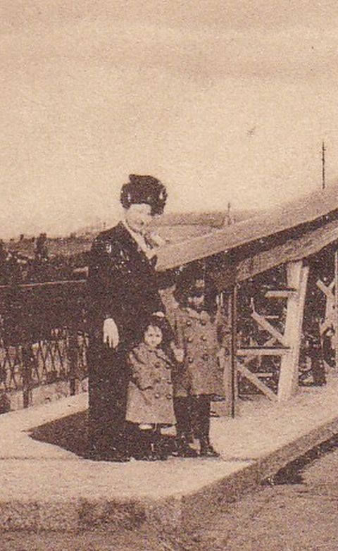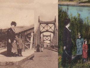 Amin az 1911-ben felavatott első, vasból és betonból készült szolnoki közúti Tisza-híd – a lap jobb felső sarkába írt felirat szerint „Szolnoki új Tisza-híd” – Szanda felőli hídfőjénél szerintem ugyanaz a család néz a kamerába. Legalább is a két gyerekkel lévő nő kalapja, fehér gallérja és ruházatának formája, illetve a gyerekek magassága és kabátjaik hossza alapján ezt kell gondolnom. A két kislány – szerintem olyan hét és öt évesek lehetnek a képeken – kabátjainak még a gombjai is egyformák. Amire a mából nézve persze lehet azt mondani, hogy na és. Mi ebben a különös?