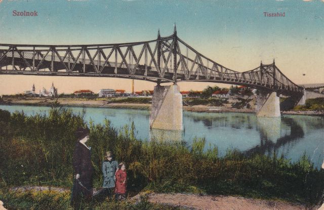 A szolnoki szép Tisza-híd tövében megörökített családról már évekkel ezelőtt írtam a blogSzolnok Album rovatában. Elsősorban azért, mert a híd pillérei között, a sétáló hölgy és a két gyerek mögött, nagyon szépen látszik a belváros felé eső Tisza-part a XX. század első éveiben. Az egyébként csak 1917-ben postára adott festett képeslap készítésének pontos dátumát akkor csak tippelni lehetett, most azonban már ki merem jelenteni, hogy 1912-ben készült a felvétel. Merthogy a Vasúti levelezőlapárusítás nevű fővárosi cég, csak 1916-ban kiadott képeslapja után egy Gettler József hírlapelőfizetési irodájának kiadásában 1912-ben megjelent, fekete-fehér lap is a tulajdonomba került.
