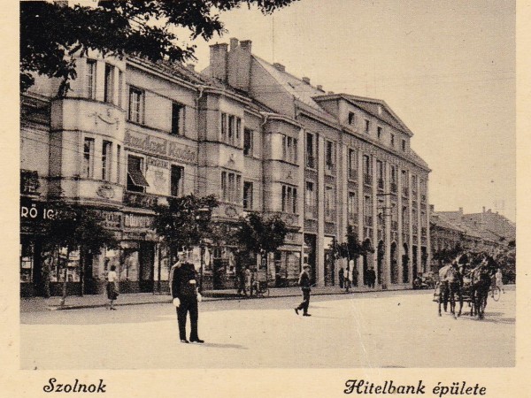 Szolnok viharos huszadik századára utal, hogy a két képen megörökített négy fontos épület közül ma már csak egy, a fotózáskor legfiatalabb, a Hitelbank épülete áll. Az alsó kép távolabbi emeletes házát csak pár évvel a felvétel készítése előtt adták át, kiváltva a Szolnoki Hitelbank ugyanezen a telken, negyedszázadon át álló, korábbi helyi székházát. Az új székház is csak részben volt banképület, hiszen a földszintjén, az árkádos bejárat két oldalán üzletek sorakoztak, második emeletén és hátsó traktusaiban pedig lakások voltak, a pénzintézet pedig az elsőn kapott helyet. A padlásteret mosókonyhának és szárító helyiségnek használták a lakók vagy a lakók cselédjei, akik egyébként elmondhatták magukról, hogy az első olyan szolnoki házban laknak, amiben már lift is működik. De ezt persze az ismeretlen fotós nem örökíthette meg.