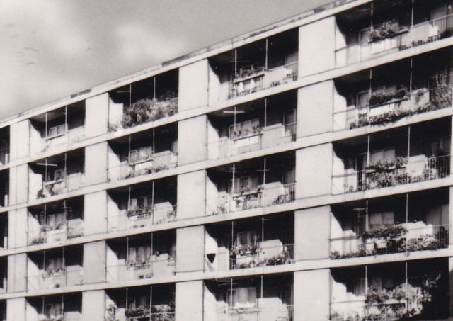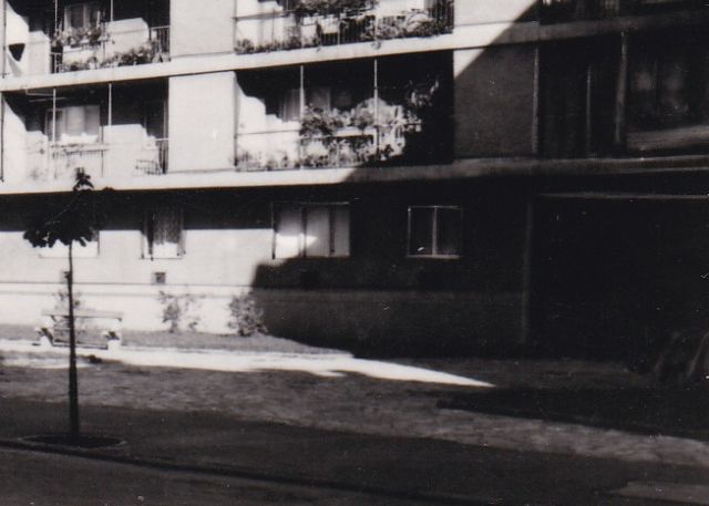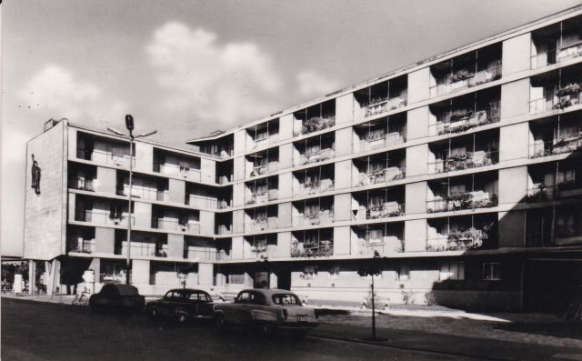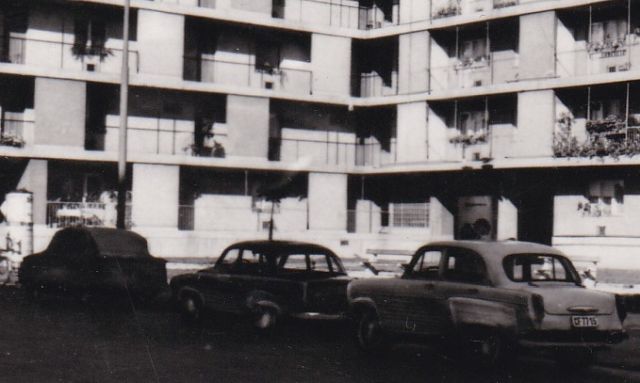 Imádom az autókat bogarászni az ilyen régi felvételeken. Az egyértelmű, hogy a járda mellett parkoló autók közül a harmadik egy Moszkvics 403-as. Miként az is, hogy az első autót az akkoriban nagyon divatos, de városképileg borzalmas „ponyvagarázs” fedi. De mi a helyzet a középen álló járgánnyal? Elsőre azt gondoltam, hogy egy 311-es Wartburg, ám a méretei és az alakja sem stimmel. Avagy, eredetileg stimmelt, és valóban egy ilyen típus parkolt ott, csak valaki, valamiért belenyúlt az eredeti képbe. Mondhatnám, véletlenül.