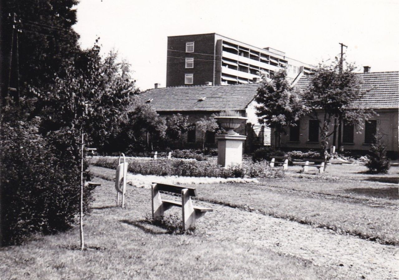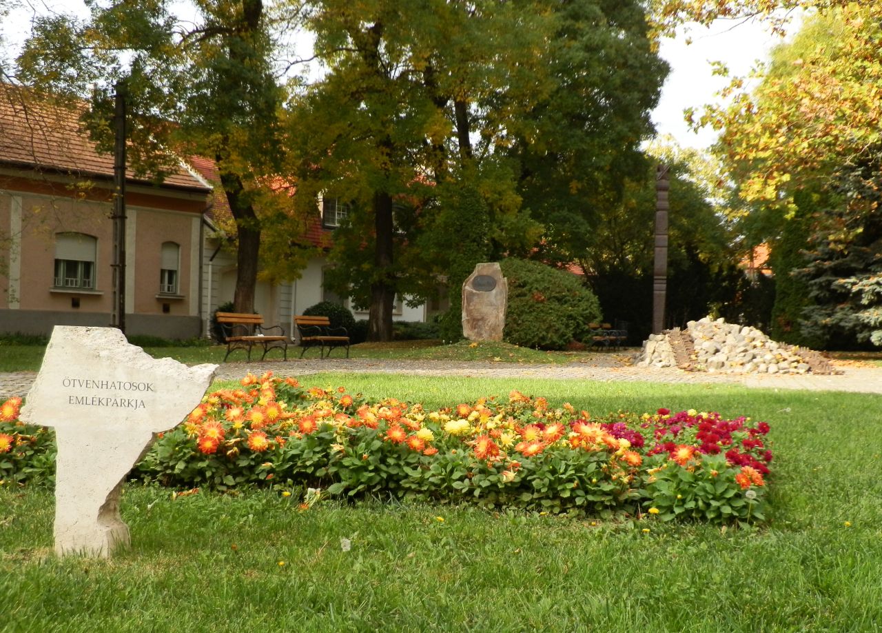 Bár az Ötvenhatosok emlékparkja elnevezés már egy 2002-es önkormányzati határozatban is felbukkan a Vártemplom északi oldala, a Művésztelep és a Bástya utca által határolt háromszög alakú terület hivatalosan nem viseli ezt a nevet. A MÁV kórház felőli házsorok a város egyik legrégebbi és 1863-tól ezen a néven emlegetett utcájában, a Bástya utcában állnak, míg a háromszög másik két szára 1992 óta a Szent István tér részei. Amikor ezen a területen, 1989 őszén elkezdték kialakítani az 1956-os emlékhelyet, talán a Gutenberg térhez tartozott, bár közterületileg ez nem volt túl fontos, hiszen ingatlan nem állt itt. Az azonban fotóval bizonyítható tény, hogy ott, ahol ma az ?56-os alkotások állnak, 1970-ben még a Verseghy parkból átkerült egyik amfora volt látható. Kérdés, hogy ez mikor tűnt el innen, és hová lett? (A fotó Dombi Gábor gyűjteményéből való.)