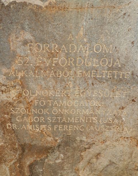 Egy a néhai recski munkatábor közeléből származó andezit tömbre került fel 2008-ban Pataky Béla domborműve, aminek alapja egy 1956. október 25-én, Szolnokon készült, a MÁV Járműjavító felvonuló dolgozóit ábrázoló fotó. Az emlékművet a Szolnokért Egyesület a város önkormányzatának és Gábor Sztámenits illetve Dr. Anisits Ferencz – 2007 óta a város díszpolgára – segítségével állította fel. A domborművet alkotó Pataky Béla Szolnokon született, itt is tanult, majd a Magyar Képzőművészeti Főiskola növendéke volt, 1958-tól pedig a Járműjavítóban, majd a Kőolajnál dolgozott, két grafikája pedig a Szolnok 900 éves reprezentatív albumban is megtalálható. Nem ez az egyetlen szolnoki alkotása, hiszen a Szapáry utcai ipartestületi székház homlokzatán látható Kreutzer Balázs és Lengyel Antal is Pataky Béla munkája.