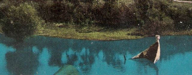 Ugyancsak a montírozásra utal a kép előterében, nagyjából a folyó közepén elsüllyedt hajó, aminek a vízből kiálló vége egy Szolnok jellegzetességének számító bőgőhajóra emlékeztet. Azt nem vitatom, hogy a Zagyván is felbukkanhattak ilyen hajók, de itt valahogy a méretek nem stimmelnek. Ráadásul, ha jobban megnézzük a folyóban tükröződő partszakaszt, és a vízből kiálló hajóorr tükörképének a hiányát, akkor már tényleg azt kell mondanunk, hogy ez a kép egy ügyes trükk. Egy lassan száz évvel ezelőtt, szerintem nem kis munkával, legalább három kép összevágásával született ez a festett képeslap.