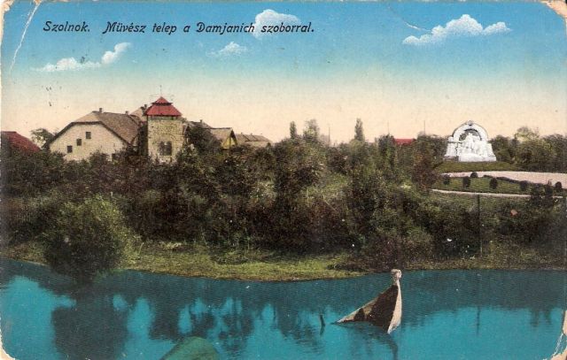 Nekem ugyanis az az érzésem, hogy ezen a képeslapon a Művésztelep házai és az épített vártorony túlságosan messze vannak a Damjanich-szobortól. Ráadásul, ha megpróbálnánk a Zagyva túlpartjáról így befogni a torony maradékát és az emlékművet, akkor a szobrot nem ilyen szögben látnánk. Tehát szerintem az történhetett, hogy a kiadó feltétlenül egy képre akarta tenni ezt a két elemet, de csak valamiféle trükkel tudta megoldani. Hogy nem valódi fotóról van szó, azt egyébként egy hiányzó elem is bizonyítja. Ha ugyanis lehetne ilyen szögből fotózni a Művésztelepet és környékét, akkor már 1915-ben is látszania kellene a vártemplomnak. Valahol a kép jobb oldalán.
