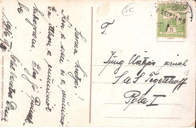 Aminek legalább annyira érdekes a hátlapja is, mint a képes oldala. Gyönyörű – igaz, ma már szinte olvashatatlan -, cirkalmas betűkkel írta valaki 1916. szeptember 10-én a barátjának. És nem máshová küldte, mint Pola-ba, azaz a mai Horvátország területén lévő, Isztria-félszigeten található Pulába. Ahol az első világháborúban az Osztrák-Magyar Monarchia haditengerészetének a fő bázisa működött. Így ott állomásozott az SMS Tegetthoff nevű csatahajó is, ahová ezt a képeslapot címezték. Mivel a feladó által írt rövid szövegben szénről és kihajózásról is szó esik, a magam részéről azt gondolom, hogy egy a hadiflottához besorozott szolnoki katona képeslapjáról lehet szó. Aki hazaérvén – „kihajózom” – pár sort küldhetett a pulai kikötőben maradt bajtársának.
