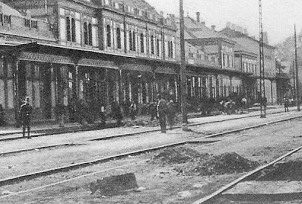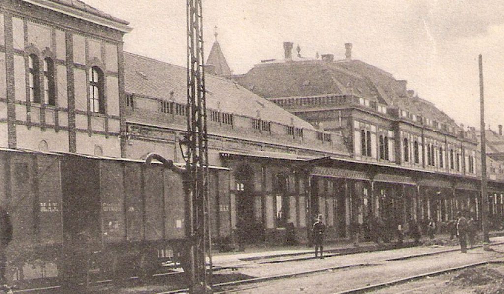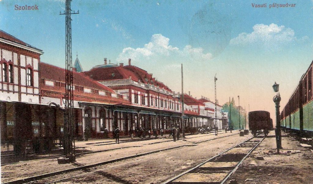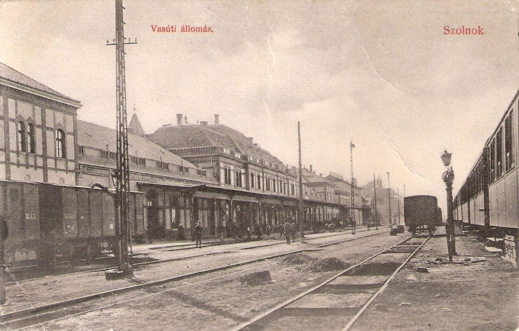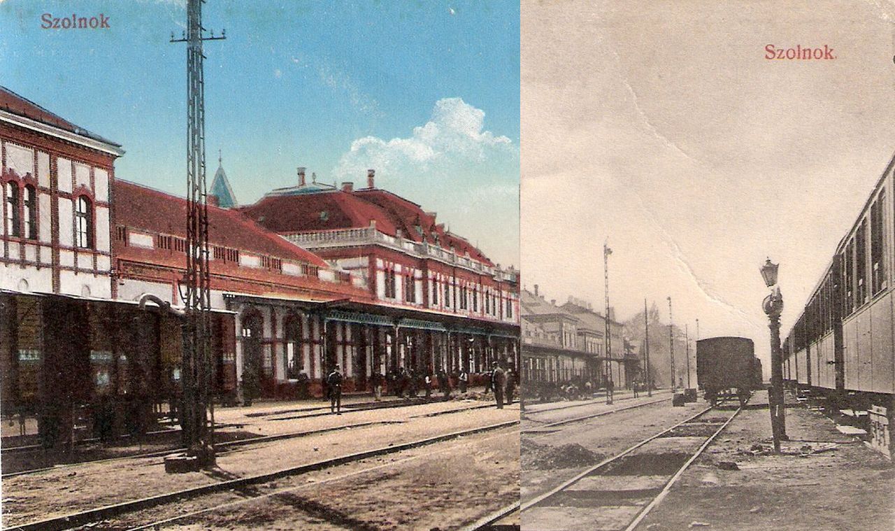 Az eredeti fotó ismeretlen készítője biztos, hogy csak 1907 után állíthatta fel kameráját a szolnoki vasútállomás negyedik és ötödik vágánya között. Leginkább azért, mert már a Pfaff Ferenc által tervezett, akkoriban új vasúti pályaudvar sínek felőli homlokzatát örökítette meg. A kép készítésekor már legalább fél évszázada ezen a helyen volt a szolnoki vasútállomás, ám az itt 1857. november 19-én átadott első utasforgalmi épület a huszadik század elejére olyan rossz állapotba került, hogy „jó érzésű ember oda nem engedte be a feleségét”. Meg legyünk őszinték: az eredetileg csak egy vonalat – Pest-Debrecen – kiszolgáló állomásépületet fél évszázad alatt már alaposan kinőtte a huszadik század elején öt irányt fogadó és indító csomópont, így ráfért Szolnokra a később sok képeslapon, sokféle irányból megörökített, és 1944. június 2-áig eredeti állapotában használt Pfaff-féle felvételi épület.