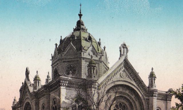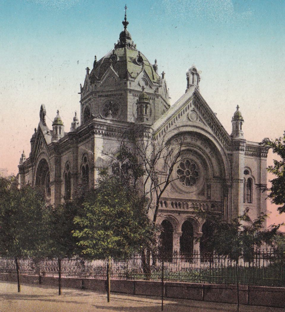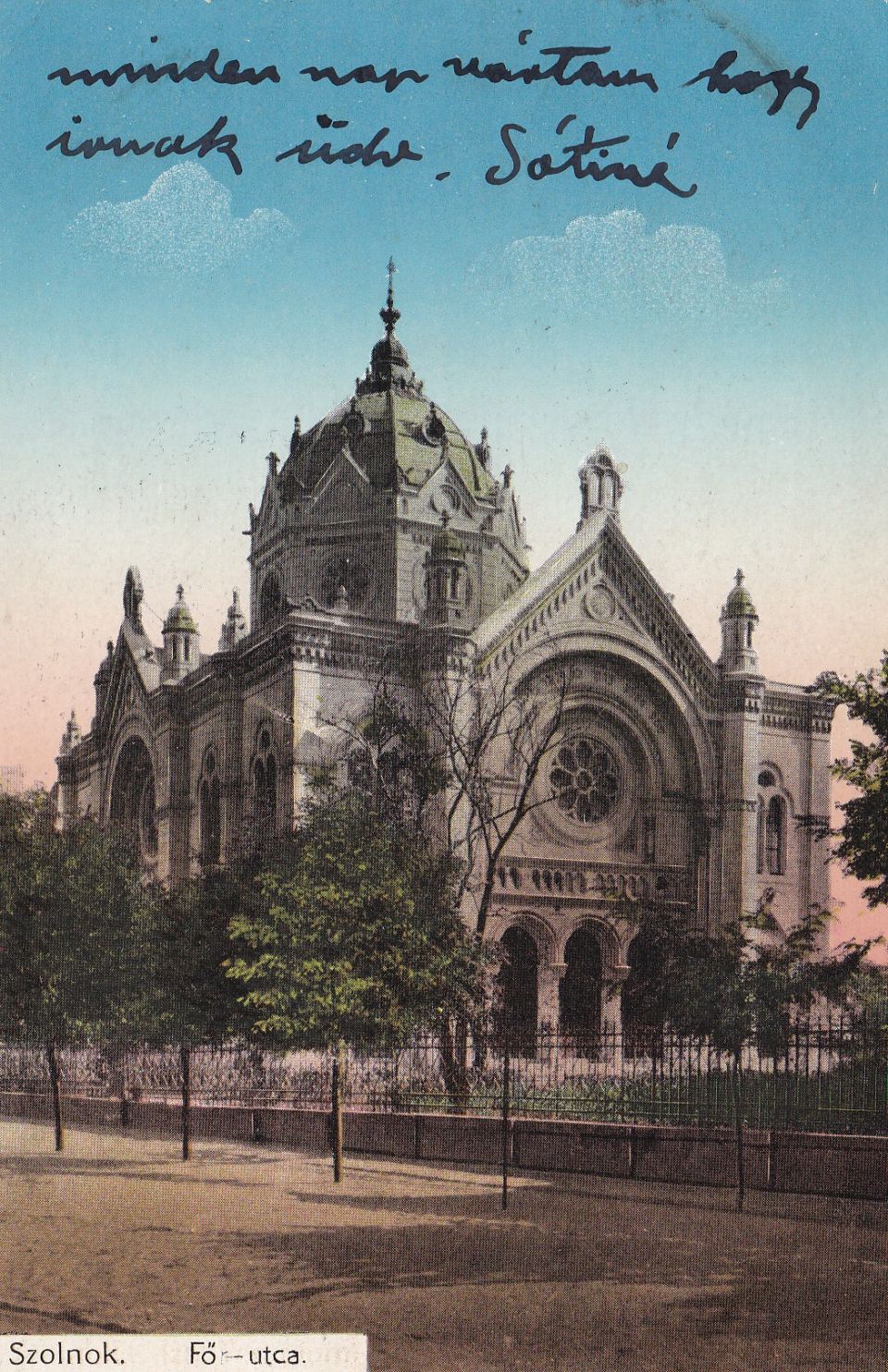 A képeslappá lett, szerintem utólag színezett fotó nagyjából a mai Templom és Sütő utca kereszteződésétől mutatja a szolnoki zsinagógát. Ami ugye a második világháborúig egész biztosan, de az is lehet, hogy a hetvenes évekig lábazatra helyezett kovácsoltvas-kerítéssel volt körbeépítve. Más képeslapok alapján úgy tűnik, hogy bár a templom főbejárata mindig a mai helyén volt, megközelíteni azonban a jelenlegi Tiszai hajósok terére nyíló kapukon keresztül lehetett. A kerítés kapcsán már többször leírtam, hogy egyes elemei a mai napig láthatóak a Szolnoki Művésztelep körül, ahová a telep valamelyik korábbi felújítás alkalmával helyezték.