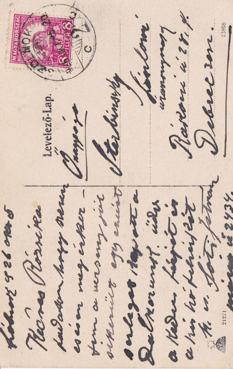 A birtokomban lévő képeslapot 1926. október 5-én küldte Szolnokról Debrecenbe egy bizonyos Sáriné Rózsikának, azaz Sterbinszky Lászlóné úrasszonynak. A meglehetősen vastag tollal írt szövegből úgy tűnik, hogy Sáriné valamiféle verseny miatt érkezett Szolnokra, ahol a képeslapja feladásáig a debreceniek már egy serleget is nyertek. Ezen kívül csak a szerencsés megérkezéséről és Rózsika családtagjainak üdvözléséről ír. Illetve olyan, mintha a lap aljára egy számot is írt volna – 2434 -, ami számomra ugyanolyan rejtélyes, mint a képeslap bal és jobb alsó sarkaiba nyomtatott különböző számok: 21271, 13898. Ez utóbbiakról feltételezem, hogy valamiféle kiadói vagy nyomdai nyilvántartási számok lehettek, de hogy pontosan mik, azt talán majd elárulja valaki.
