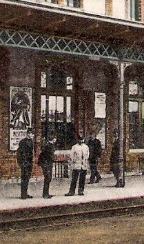Az eredeti fotó nyomtatás előtti színezésére a legjobb bizonyítékot a képen látható emberek szolgáltatják. Mert miközben a klinkertégla részek téglavörösek, a cserepek pirosak, a távolabbi tetők zöldes, az ég kékes színűek, az állomáson ácsorgó emberek fekete-fehérek és szürkék. Ami ugye kizárt. Amint az is, hogy a fedett peronon, a földszinti ablakok közé elhelyezett plakátok – majdnem egy tucat látszik a lapon – is fekete-fehérek lettek volna.