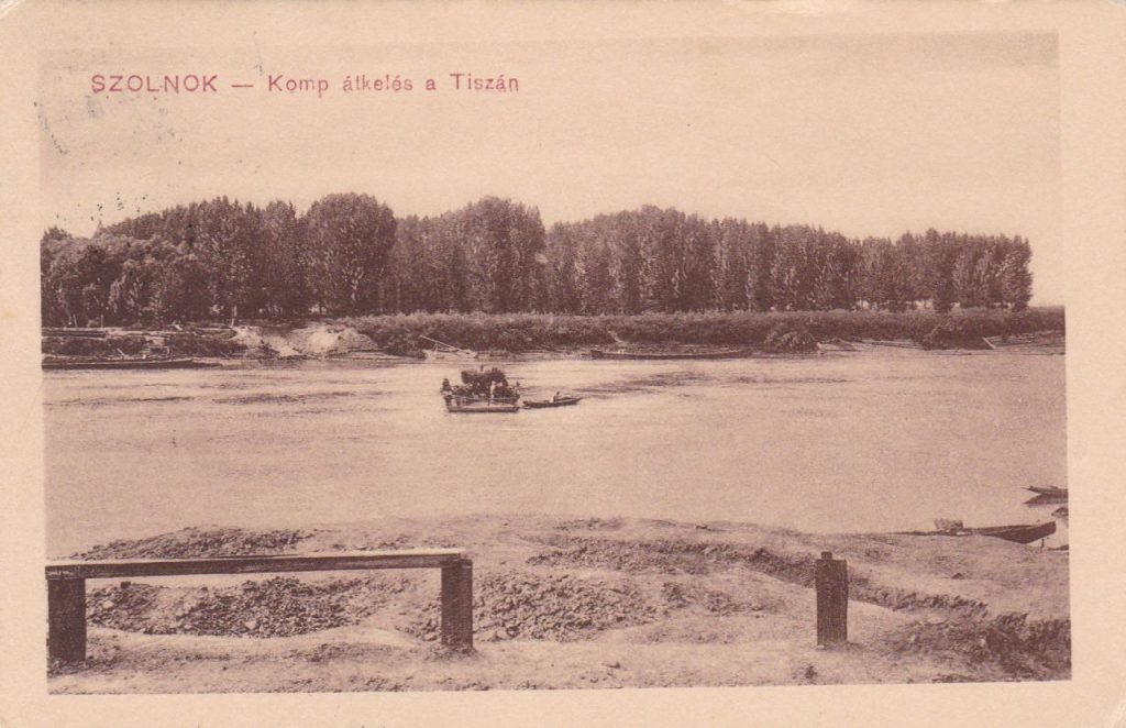 E képeslap kapcsán még egy dologra hívnám fel a figyelmet. A felvétel jobb szélén ugyanis látszik, hogy a 20. század elején a belvárossal szemben lévő oldalnak csak egy része volt fákkal betelepítve. A szép sorban ültetett fákon túl, egészen a Tisza nagy kanyarulatáig kopár, ártéri legelő volt a mai Tiszaliget területének legalább a háromnegyede. Ezért némi túlzás ma arról beszélni, hogy a Móricz-liget a Tiszaliget elődje. Maximum előhírnöke. Ami majd csak azt követően alakul ki és kapja meg mai nevét, hogy az ezen a képeslapon megörökített komp helyén még kétszer kellett hosszú hónapokon keresztül így átkelni. Másodjára 1919 és 1921 között, mivel a román ostrom idején a „szép” Tisza-híd belvárosi hídfője megsérült. Harmadjára pedig 1944 ősze és 1946 kora nyara között, amikor Szolnok első vasbeton közúti hídja végleg megsemmisült, és helyére megépült az ideiglenesnek szánt, de végül 1963-ig szolgáló átkelő.