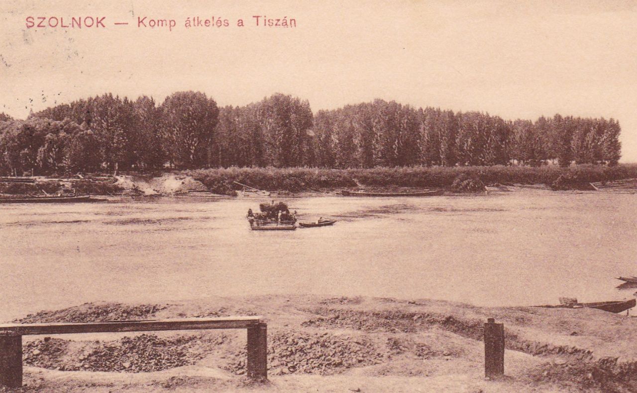 E képeslap kapcsán még egy dologra hívnám fel a figyelmet. A felvétel jobb szélén ugyanis látszik, hogy a 20. század elején a belvárossal szemben lévő oldalnak csak egy része volt fákkal betelepítve. A szép sorban ültetett fákon túl, egészen a Tisza nagy kanyarulatáig kopár, ártéri legelő volt a mai Tiszaliget területének legalább a háromnegyede. Ezért némi túlzás ma arról beszélni, hogy a Móricz-liget a Tiszaliget elődje. Maximum előhírnöke. Ami majd csak azt követően alakul ki és kapja meg mai nevét, hogy az ezen a képeslapon megörökített komp helyén még kétszer kellett hosszú hónapokon keresztül így átkelni. Másodjára 1919 és 1921 között, mivel a román ostrom idején a „szép” Tisza-híd belvárosi hídfője megsérült. Harmadjára pedig 1944 ősze és 1946 kora nyara között, amikor Szolnok első vasbeton közúti hídja végleg megsemmisült, és helyére megépült az ideiglenesnek szánt, de végül 1963-ig szolgáló átkelő.