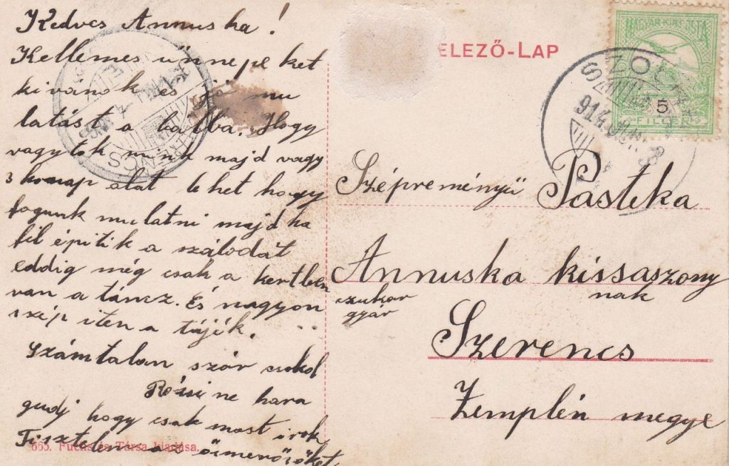 A Szapáry utca két oldalán futó járda, fasor, középen lévő kövezett kocsiút mellett legalább annyira érdekes ennek a lapnak az írott hátulja. Sajnos a postázója elfelejtette aláírni, de a megszólítás és a szöveg alapján valószínűsíthető, hogy „Szépreményű Pastelka Annusa kisasszonynak” egy fiatalember küldhette ezt az anzikszot 1914. június 8-án – három héttel a nevezetes merénylet előtt – Szolnokról Szerencsre. Az íráskép alapján biztosak lehetünk abban, hogy tanult fiatalember lehetett az illető, aki nemcsak azt írta a címzéshez, hogy „Szerencs, Zemplén megye”, hanem apró betűkkel, hogy „czukorgyár”. Így akár vissza is lehetne keresni, hogy a Szerencsi cukorgyár területén – a gyárban vagy az ahhoz kapcsolódó „lakótelepen” – ki is lehetett a címzett. Akinek valamiért „kellemes” ünnepeket kívánt az anziksz író, és reményének ad hangot, hogy három hónap múlva mulatnak majd… Ha felépítik a szállodát.