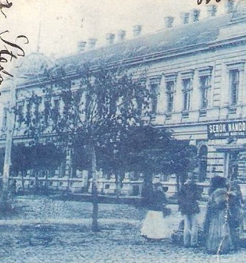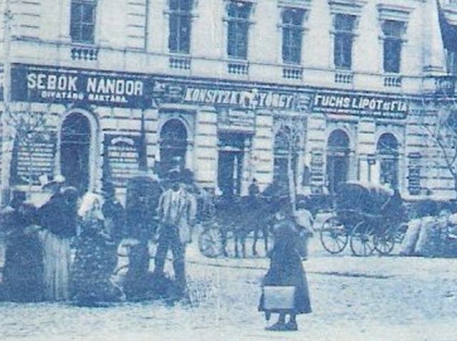 A szolnoki városházát és a Kossuth tér keleti oldalát ábrázoló képeslapot a XIX. század utolsó éveiben adta ki a Fuchs Lipót és fia cég. Akiket a fotó elkészítésében – vagy elkészíttetésében – nem csak az vezérelhetett, hogy az akkor alig negyedszázada megyeszékhely, másfél évtizede felépített, impozáns „városház épületét” megörökítsék, hanem hogy saját cégüknek is egy kis reklámot csináljanak. Ha ugyanis jobban megnézzük ezt a nagyjából a mai 1-es irodaház – Néplap székház – helyéről készített felvételt, akkor észrevehetjük, hogy Sebők Nándor és Kositzky György portáljai mellett a harmadik a Fuchs Lipót és fia cégé. Mint közismert, Szolnok új, emeletes városházáját 1884-ben úgy építette fel a város, hogy annak költségeit a földszinti üzlethelyiségek bérleti díjából törlesztette. Így lehetettek a Sebők és a Kositzky üzletek a mai házasságkötő terem helyén, Fuchsék cége pedig nagyjából a jelenlegi Sörárium lejáratánál.