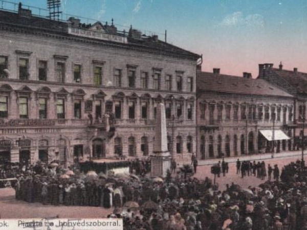 Mi történhetett 1915-ben Szolnok főterén, amit akkor már vagy húsz éve nem „Piacz térnek”, hanem Kossuthnak hívtak? Bár kétségtelen, hogy hetente több alkalommal is betöltött ilyen funkciót a Városháza előtti placc. Fontos esemény lehetett, hiszen Szigeti Henrik udvari fényképész – aki ekkor már majdnem negyedszázada örökítette meg várost és a szolnokiakat – méretes masinájával felkéredzkedett a lassan tíz éve álló Népbank – ma Sztár fitnesz – vagy a rég elbontott Steiner-ház első emeleti erkélyére, hogy onnan fogja be a 68-as obeliszk körüli teret. Bizonyos, hogy valamiféle szervezett ünnepséget tartottak a Külső Szolnok Megyei Takarékpénztár – jelenleg múzeum – épülete előtt, hiszen a megjelent tömeg viszonylag rendezetten, legalább három tömbben sorakozott fel, ráadásul katonák is biztosították a helyszínt.