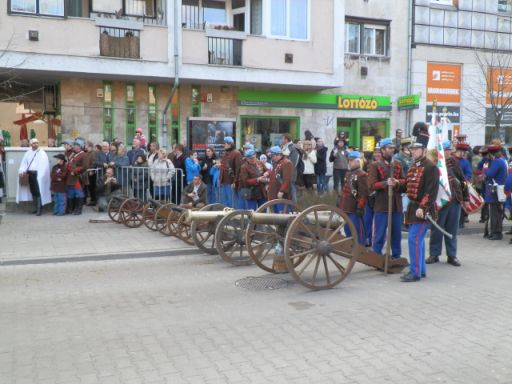 A Szolnoki csatát az árusok is kezdik felfedezni. A ragadós nyalánkság kínálói már nemcsak a könyvtár előtt, de a tér másik oldalán is sátrakat vertek, ahogy a magyar tematika köré szerveződő kereskedőkből sem volt hiány. Lehetett venni fakardot, csákót, pajzsot és zászlót, de jelvényben és kokárdában sem volt hiány. Az egyik sarokban pedig szerényen egy fűzfavesszőből fegyvert fonó bácsi is elücsörgött. Sőt – ez számomra újdonság volt – emléklapot is osztogattak a nézők között. Árnyékban állva még hideg volt. A Múzeum oldalában, a napon viszont már kellemes tavaszi volt az idő.