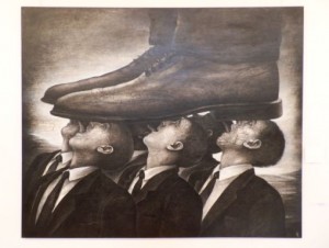 Szurcsik József néhány munkája előtt egyszerűen földbe gyökerezik az ember lába. A kiállítás plakátjának is választott Alattvalók nemcsak örökérvényű témát feszeget, de színtelenségével, alakjaival egyszerre félelmetes, nyomasztó és felszabadítóan kacagtató. A Gerinctelenek, az Egyenes út vagy éppen a Besúgóverseny más méretekben, más technikával, de lényegében ugyanezt a témát járják körbe fájó öniróniával. Miként a Szövetségesek, az Ellenségek vagy éppen a Diadalív. Azt hiszem, ennek a kiállításnak a nagysága éppen abban rejlik, hogy bár egy évtizedeken átívelő életművet vonultat fel, hanem hogy mind a hetvenöt alkotásával ugyanarról a világról mesél. Arról, amiben élünk.