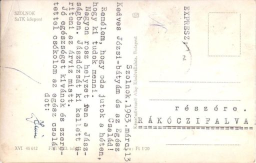 Utána kellett néznem, hogy minek a rövidítése az SZTK, amivel a mai napig jelöljük a szolnoki Hősök terén álló rendelőintézete. Meg annak is, hogy 54 évvel ezelőtt mi történt a Jászságban, hogy ki kellett telepíteni Jászdózsát. Amiről ez az 1 forint 20 filléres, expresszként feladott képeslap tudósít.