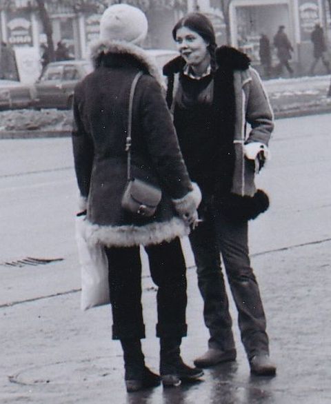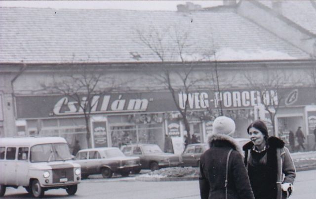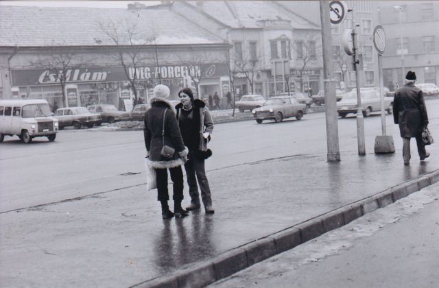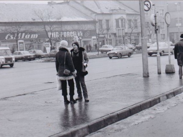 Hol diskurál ráérősen ez a két irhabundás, fiatal hölgy? Az avatott szemek, akik még emlékezhetnek Szolnok jó három és fél évtizeddel ezelőtti arcára rögtön rávágják: a Beloiannisz út elején, a pártház előtt. A fiatalabbak meg talán a felvétel jobb széle alapján a homlokukra csapnak: az ott a nagyposta, tehát a Baross úton járunk, jártunk.