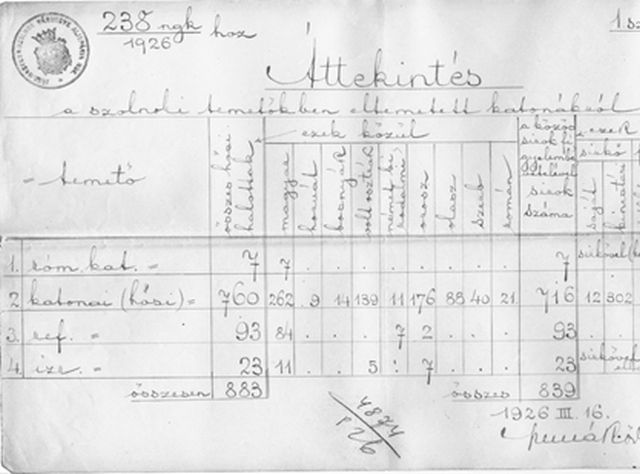 – A levéltárunkban található egy 1926. március 16-án kelt, a megye alispánjának bélyegzőjével ellátott irat, amely a szolnoki temetőkben eltemetett katonákat veszi számba. Ez összesen 883 hősi halottról tesz említést, akik közül 760 szerepel a „katonai” sorban. Közülük 262 magyar, 9 horvát, 14 bosnyák, 139 osztrák, 11 német birodalmi, 176 orosz, 88 olasz, 40 szerb, 21 román.