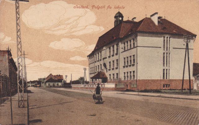 Ez a fotó ugyanis szerintem csak 1915-ben készülhetett. Egyrészt azért, mert az ismeretlen katona 1915. november 2-án küldte Szolnokról Csehországba, amikor még mindkettő az Osztrák-Magyar Monarchia része volt. Másrészt a ma megyei rendőrkapitányságként szolgáló Polgári fiúiskola már teljesen készen van, semmi nyoma az építkezésnek, amit pedig legkorábban 1914-ben lehetett megörökíteni. Mivel azonban az apró facsemeték még nem indultak meg, viszont a taligát toló ember felgyűrt ingujjal látható a fotón, feltételezem, hogy ez egy kora tavaszi felvétel. Ami a fentiek miatt csak 1915-ben készülhetett el.