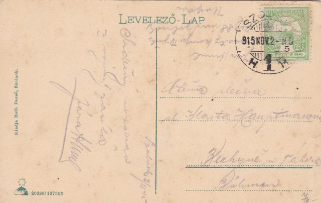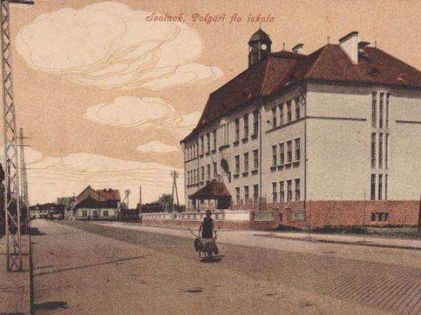 Ez a fotó ugyanis szerintem csak 1915-ben készülhetett. Egyrészt azért, mert az ismeretlen katona 1915. november 2-án küldte Szolnokról Csehországba, amikor még mindkettő az Osztrák-Magyar Monarchia része volt. Másrészt a ma megyei rendőrkapitányságként szolgáló Polgári fiúiskola már teljesen készen van, semmi nyoma az építkezésnek, amit pedig legkorábban 1914-ben lehetett megörökíteni. Mivel azonban az apró facsemeték még nem indultak meg, viszont a taligát toló ember felgyűrt ingujjal látható a fotón, feltételezem, hogy ez egy kora tavaszi felvétel. Ami a fentiek miatt csak 1915-ben készülhetett el.