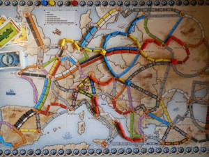 Azóta is imádom a térképeket. Meg a társasjátékokat. Így nem csoda, hogy a világtérképpel operáló társasok kifejezetten közel tudnak kerülni a szívemhez. Nem véletlen, hogy a Ticket to Ride (másik verzióban Zug um zug) társasjáték siker lett nálam. Merthogy e játék alap sztorija, hogy különböző földrészek városai között kell vasútvonalakat kiépíteni. Így volt alkalmam feleleveníteni az amerikai kontinens nagyvárosait (Zug um Zug) épp úgy, mint az európaiakat a Ticket to Ride-nak köszönhetően. És, ahogy a világhálót elnézem: rengeteg verzió (azaz térkép) közül válogathatok még. Sőt, az igazi megszállottak már a magyar vasúthálózatot tükröző barkácsverziót is elkészítették, így előbb-utóbb talán Révfülöp és Kengyel között is kiépíthetem a saját vonalamat, mondjuk, Rákos-rendező érintésével.