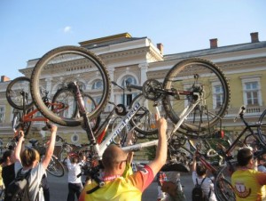 A Kossuth téren, a városháza előtt még összeállt a lelkes csapat, hogy a feje fölé emelt bringákkal jelezze, nemcsak azt, hogy szeret bringázni, igyekszik óvni a Földet, de azt is, hogy minél több és jobb kerékpárutat szeretne a városban. Hogy péntek este hatkor ezt valaki észlelte-e a városházán? Csak remélni lehet.