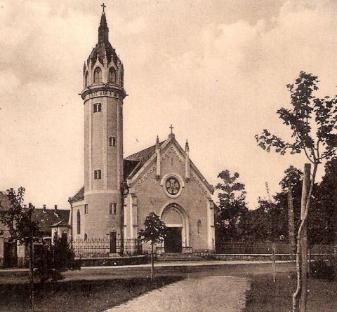 Magát a templomot arról a helyről, ahonnan ez a kép készült, ma már nem tudnánk lefotózni, hiszen ott jó ideje valamelyik közműcég kiszolgáló létesítménye áll. De nem készülhetne ilyen kép azért sem, mert a templom környéke alaposan megváltozott az elmúlt nyolcvan évben. A kertje mögött látható emeletes ház szerintem az egykori csendőrlaktanya részlete, aminek a helyén évtizedek óta állnak a Szigligeti utca társasházai. Miként a templomtól jobbra is négyemeletes házak sorakoznak az ezen a képen még park tűnő területen.