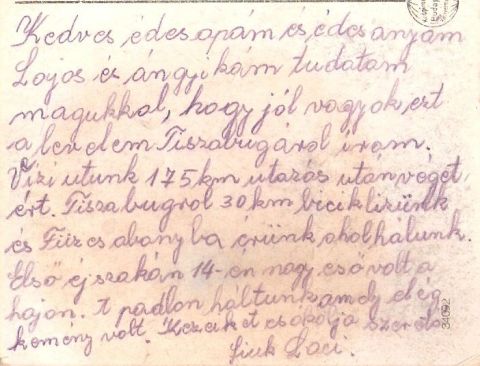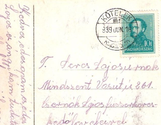 A fiú írása további két dologra enged következtetni. Egyrészt a fiatalember valószínűleg nem pontosan értette, hogy a vízitúrájuk hol ért véget, hiszen családjának szóló üzenetében az olvasható, hogy „Tiszabugáról” ír. A megtett távolság, a Füzesabonyig hátralévő bicikliút és a név hasonlósága alapján azt gondolom, hogy akár Tiszaburánál is kiköthettek. Ám ennek ellentmond, hogy a Bura a Tisza bal partján található, miközben nekik a másik oldalon kellett folytatni útjukat. Illetve az is fura, hogy a lapot Kőtelken, azaz pár kilométerrel lentebb adta postára. Ez utóbbi miatt arra gondolok, hogy a harmincas években szolnoki képeslapokat is árultak a környező települések postahivatalaiban, amelyeket nem elsősorban a rajtuk lévő fotók miatt használhattak a vásárlók. Minden bizonnyal Seres Lászlót is teljesen hidegen hagyta, hogy a szüleinek küldött képeslapon a szolnoki evangélikus templom látható.
