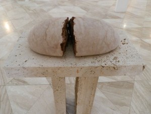 Állok a Szolnoki Galéria földszintjén és jót szórakozok Kuti László Kenyértörés című alkotásán, pedig nem más, mint egy kenyérformájúra csiszolt gyönyörű kő, ami úgy van kettétörve, hogy hirtelen a morzsák hullását várom. Mosolyognom kell, mert számomra ez egy jó geg, amit akár tovább is gondolhatok a kenyér és a kő örökkévalósága mentén, vagy éppen a kenyér helyett beleláthatok egy mézeskalácsot, amiből aztán elindulhat a fantáziám az ünnepek irányába.